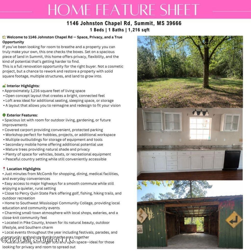 Welcome to 1146 Johnson Chapel Rd in Summit, Mississippi, calling all investors and visionaries.This property is a true opportunity for someone ready to take on a project and create value. Nestled in a quiet, private setting, the land offers space, potential, and the kind of canvas that's getting harder to find.The home itself is not move-in ready and requires significant renovation. This is a complete fixer in need of serious TLC, making it best suited for investors, flippers, or buyers looking to build equity through improvements.The property also includes additional structures, including a guest house (featured in the photos) and a mobile home that will require work as well, adding even more potential for those with the right vision.Please note:¢ Photos have been virtually cleaned up for presentation purposes.If you've been waiting for a property where you can renovate, rebuild, or reimagine from the ground up, this is your chance to step in and bring it back to life.